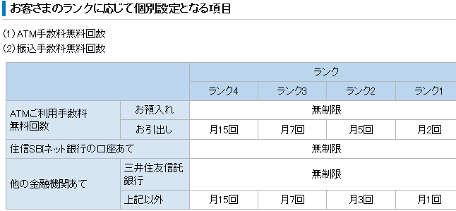 お金を下ろすことはめったにないのでランク1でもいいですが、たまに振込することがあるので少し使いづらいです。いくつかの条件がありますが、例えば外貨預金とSBIハイブリッド預金の月末残高があることでランク2を達成できます(私はコレ)。手間なくランク3としたい場合は、指定のクレカ(ミライノカード/JCB)を作り1万円以上の引き落としが発生するような仕組みを作れば達成できます。住宅ローンを利用してもランク3となります。ランク判定条件はこちら。