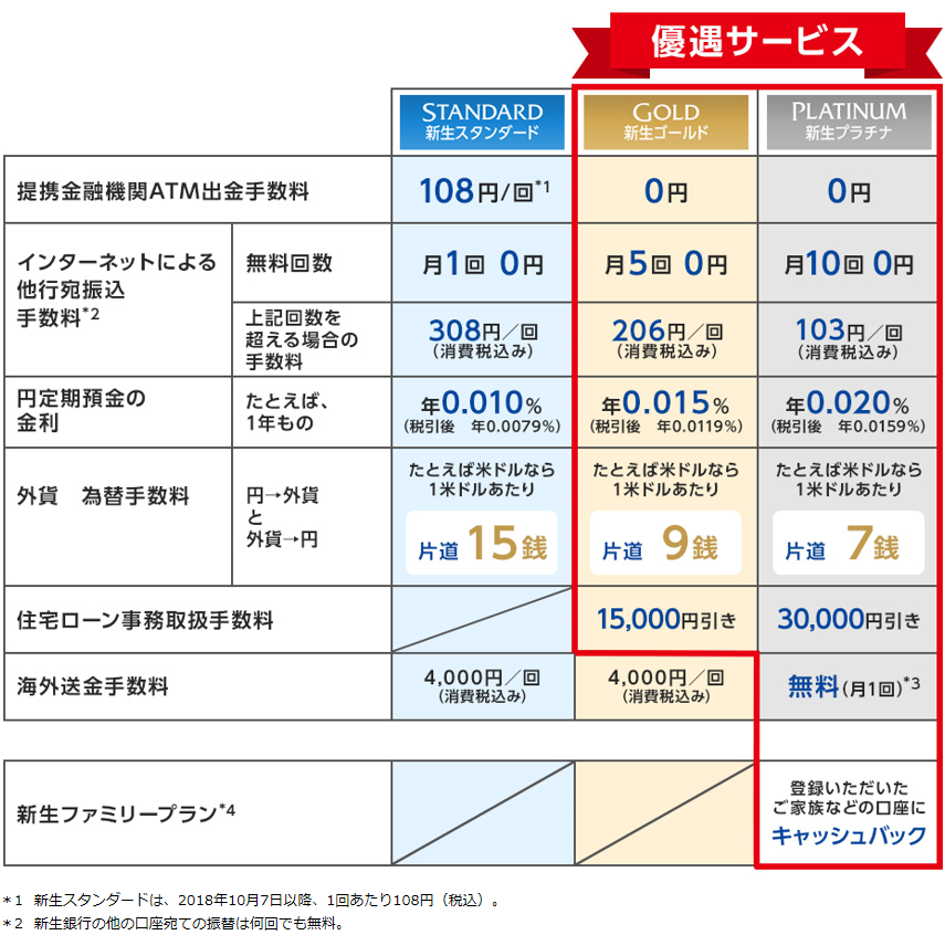 昨年、ATM手数料が無料から108円に値上げされました。新生銀行には「新生ステップアッププログラム」という利用内容に応じたランク制度があり「新生ゴールド」「新生プラチナ」は引き続き無料です。